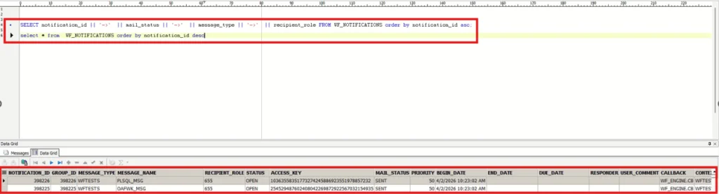 9. Now open toad and run this query: select * from WF_NOTIFICATIONS order by notification_id desc