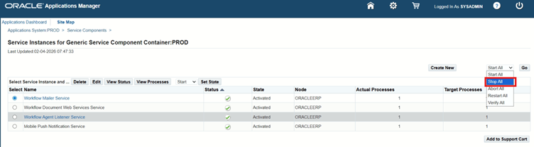 1. Go to site map 2. Click notification mailer 3. Select Workflow Mailer Service 4. Open LOV and click on stop all 5. Click ok 6. Now reload browser until the status set to deactivated 7. Now click on start all