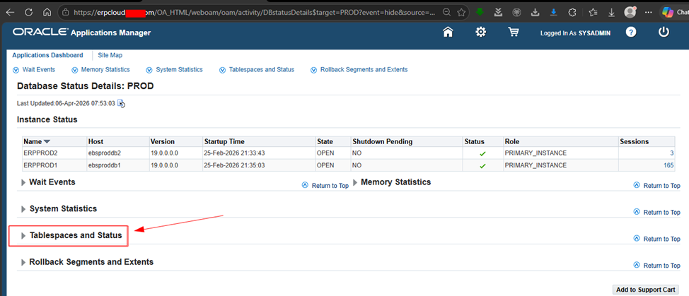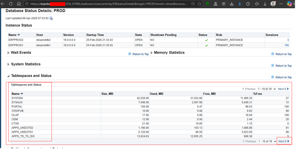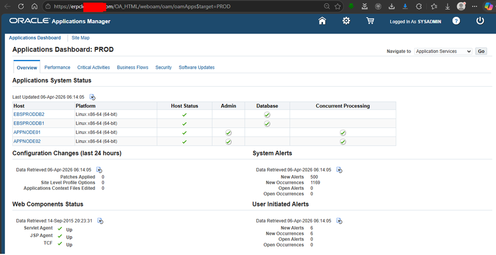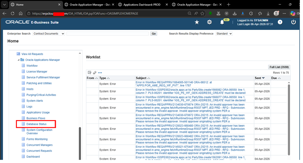 You don’t always need direct database access to perform basic but essential health checks on your Oracle E-Business Suite 12.2 environment. Oracle Applications Manager gives you excellent visibility into database instance status, tablespace usage, overall system health, and Workflow services directly from the application tier.