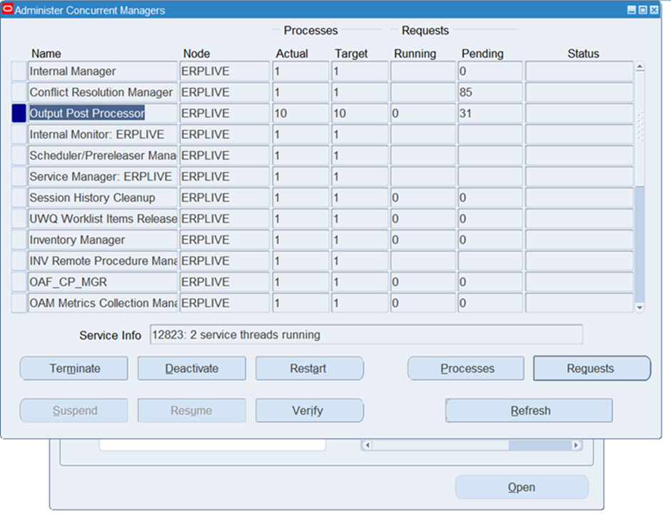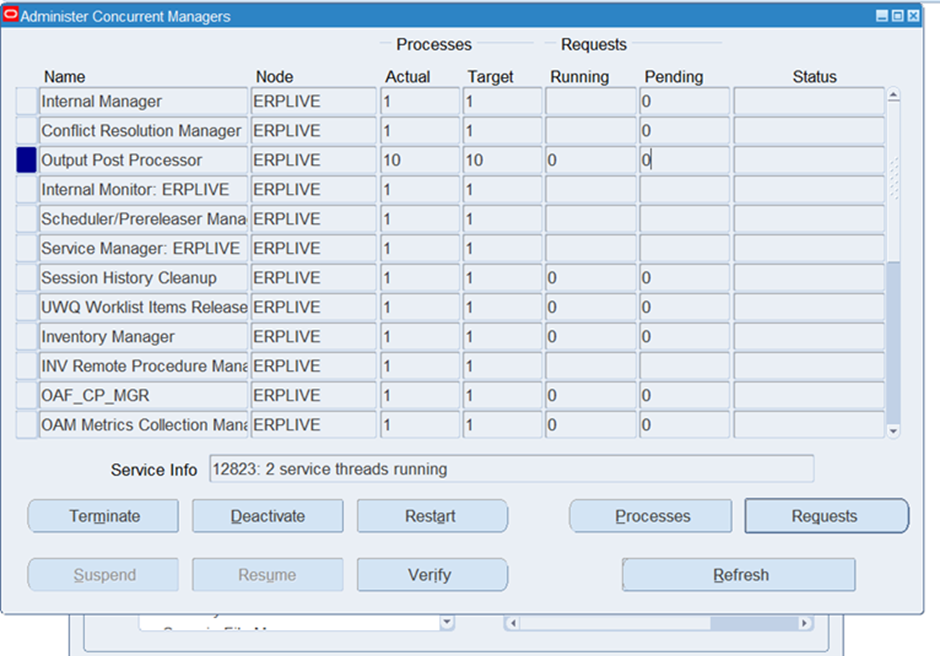 Checked Concurrent Processes for OPP I opened the Processes screen for the Output Post Processor and observed that 10 processes were active and running.