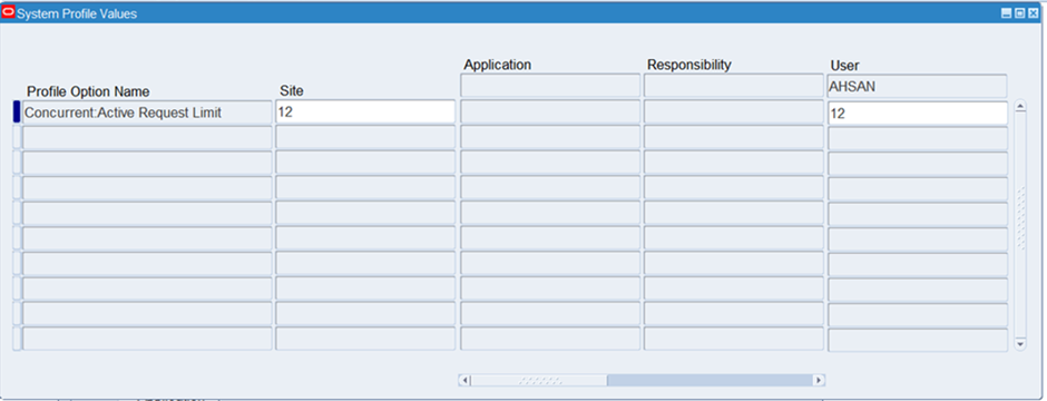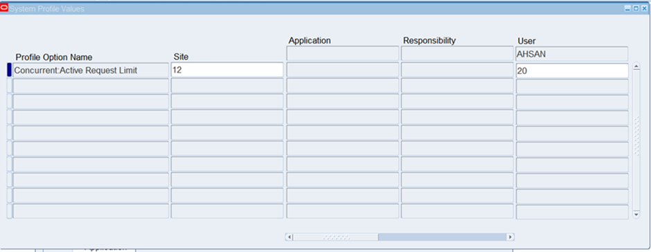 I increased the Concurrent:Active Request Limit profile option for the specific user AHSAN from 12 to 20.