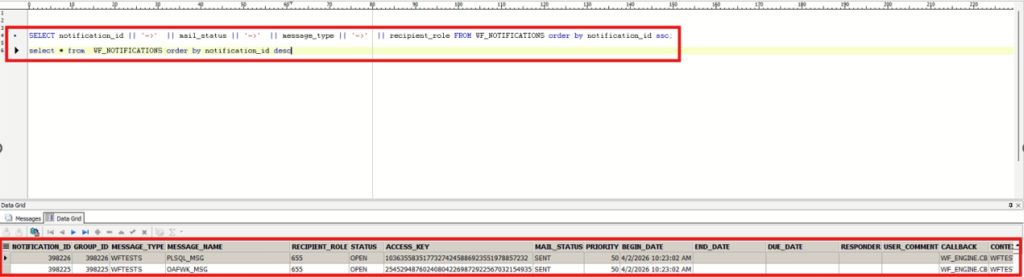 Now open toad and run this query: select * from WF_NOTIFICATIONS order by notification_id desc